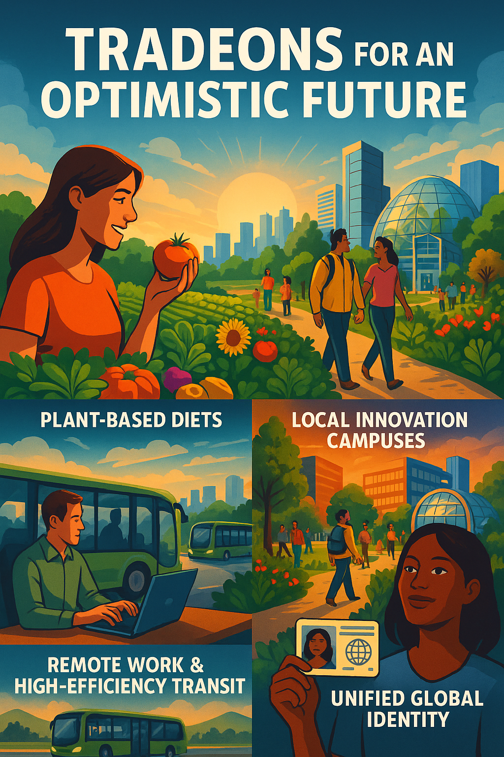 At the same time, it is important to acknowledge that implementing these tradeons in the real world is neither trivial nor purely technical. Each of these ideas runs into existing power structures, cultural norms, economic interests, and understandable fears. Moving toward plant-based diets challenges long-standing culinary traditions and large industries. Building Symbiotic Cities and hybrid commute systems asks families to rethink where and how they live and work. A unified global identity framework has to be designed with extraordinary care around privacy, equity, and governance to avoid becoming a tool of surveillance or exclusion. In other words, we are not just dealing with engineering constraints; we are dealing with historical trauma, trust, and questions of who gets to decide how the system evolves.